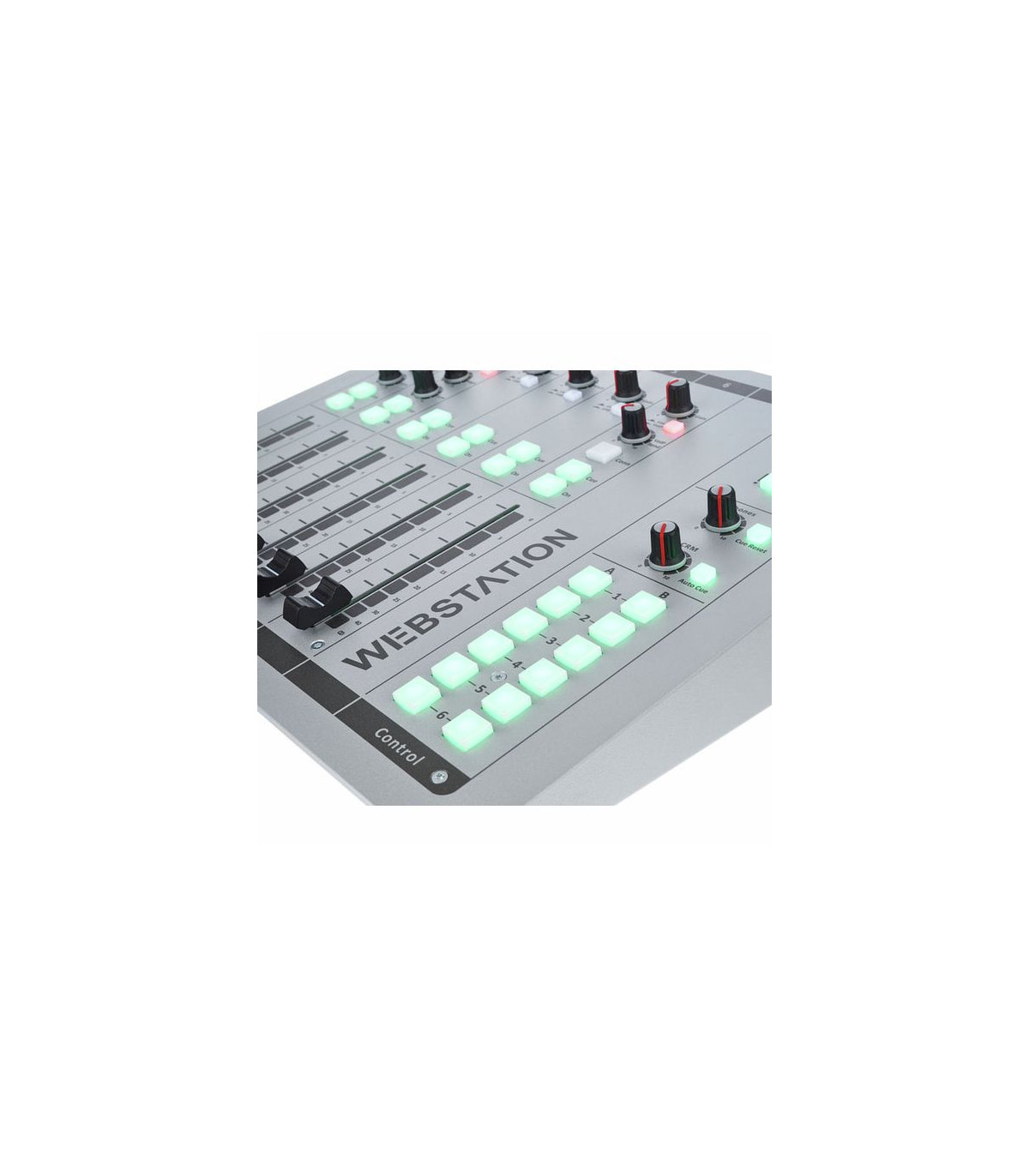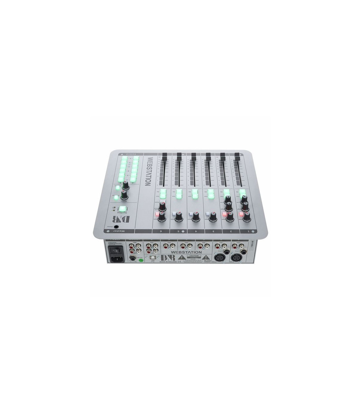 La mesa de mezclas WEBSTATION cuenta con 2 entradas de micrófono balanceadas con alimentación fantasma e inserciones para procesadores de voz externos. Seis