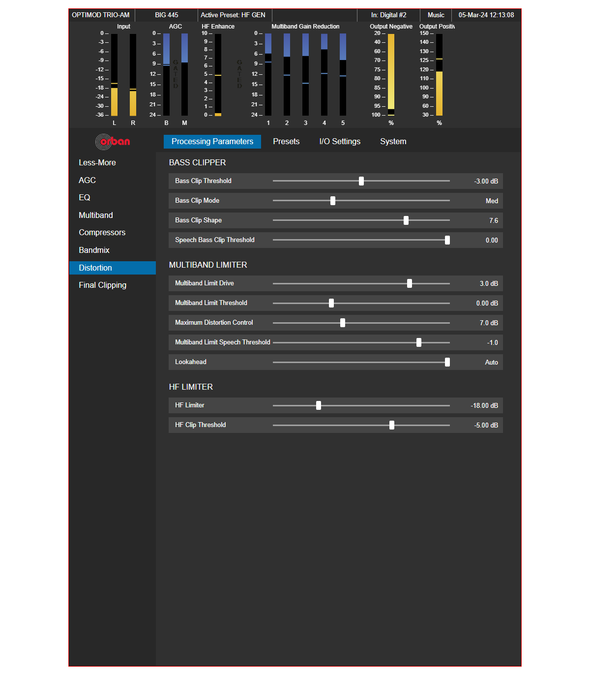 Like all OPTIMODs, Trio also comes with a variety of factory presets; Orban’s exclusive “Less-More” control simplifies creating your own signature sound.